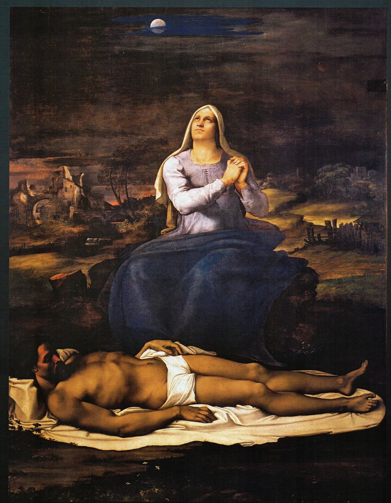 The nocturnal Pietà was painted between 1513 and 1516 following designs by Michelangelo who also did the carboncino sketches, a face and a full figure, visible on the painting's retro.